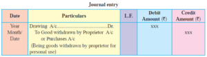 Example : Goods Withdrawn by Proprietor : When the proprietor takes goods from the business for personal use, it is called drawings. In this case, the Drawings Account is debited and Goods (Purchases) Account is credited, as the goods go out of the business.