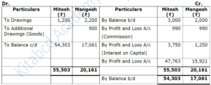 - The adjustments like commission to partners, interest on capital, and goods withdrawn by Mangesh are recorded in the Current Accounts.