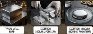 (iii) Hardness and Physical State : Most metals are hard and solid at room temperature.