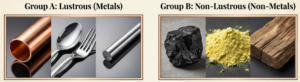 Materials around us are mainly classified into two groups based on their properties: metals and non-metals.