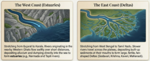 | River Features | Short rivers; forms estuaries (e.g., Narmada, Tapti) | Large rivers forming deltas (e.g., Ganga, Mahanadi) |