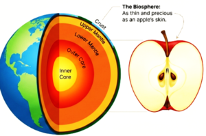 A Delicate Surface: If Earth were the size of an apple, all life-from the deepest ocean trench to the highest mountain-would exist on a layer as thin as the apple's skin. This delicate crust is where the miracle of life unfolds.