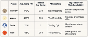- Greenhouse effect: Gases like carbon dioxide trap some of the Sun’s heat and keep Earth warm. This gentle greenhouse effect maintains a suitable temperature. On Venus, too much carbon dioxide causes extreme heating, making it the hottest planet.