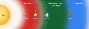 - Liquid water is necessary for life to develop and continue. Earth’s position allows water to remain liquid, making life possible. This special range of distance from the Sun where liquid water can exist is called the habitable zone or the Goldilocks zone.