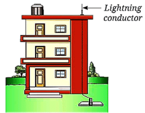 To protect buildings, a lightning conductor (a metal rod fixed on the top and connected to the ground) provides a safe path for the electric charge to travel into the earth.