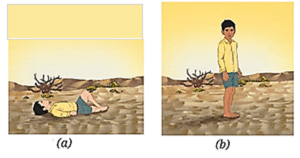 Question 3. Fig. (a) shows a boy lying horizontally, and Fig. (b) shows the boy standing vertically on a loose sand bed. In which case does the boy sink more in sand? Give reasons.
