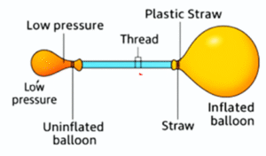 balloon has low pressure inside. When the two balloons are connected through a straw, air moves from high-pressure area (inside the inflated balloon) to the low-pressure area (inside the uninflated balloon).