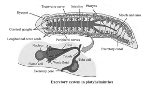 - Protonephridia or Flame cells : They are the excretory structures in Platyhelminthes (e.g. Planaria), rotifers, some annelids and the cephalochordate-Amphioxus. They are primarily concerned with ionic and fluid volume regulation, i.e. osmoregulation.