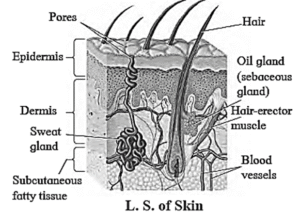 Skin : It helps in removing excess water, salts (NaCl) and other wastes (urea, lactic acid) via sweat and sebaceous gland.